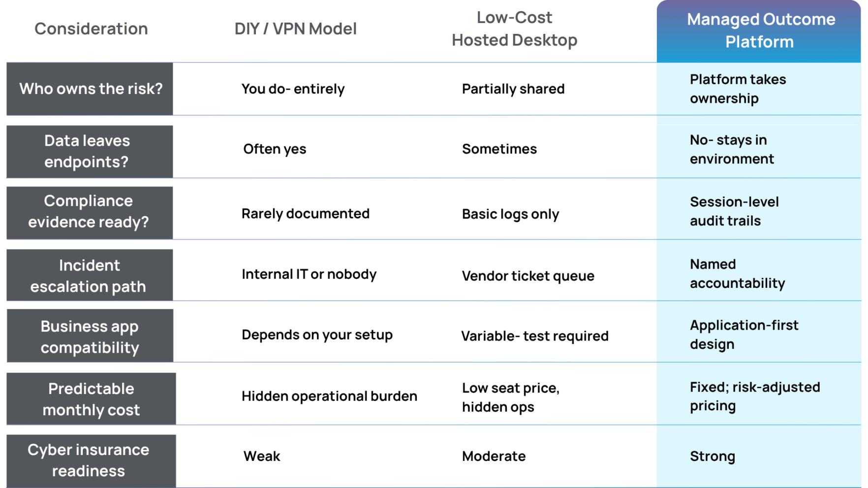 The seat-price comparison almost never holds up when something actually goes wrong. A low-cost hosted desktop with no real escalation path, no compliance documentation, and no application-specific support turns a small monthly saving into a significant incident cost.
